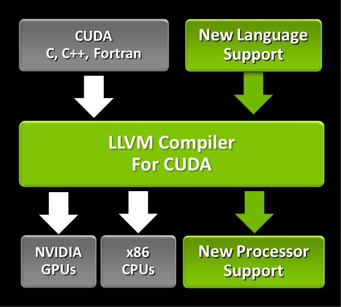 為了軟體應用的開發,也推出了以Nvidia CUDA LLVM的Compiler,透過這樣的技術,可以讓不同平台的CPU或GPU處理器,都可以使用編譯出來的中介程式碼,來減少程式的重複開發,並獲得程式碼最佳化優點。