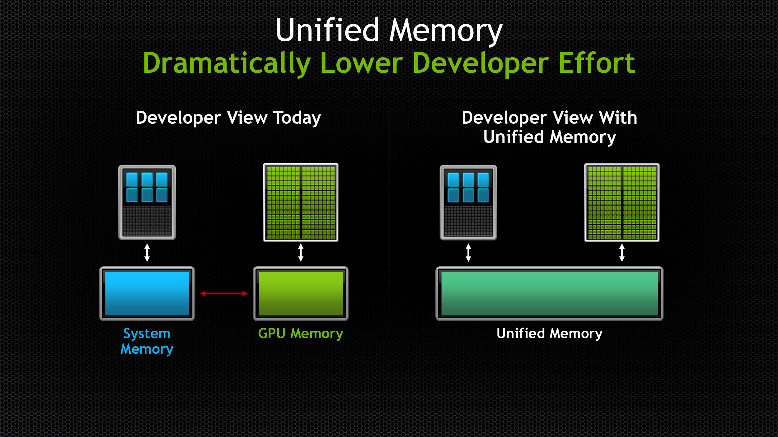 在新的CUDA規格裡也提到了新的Unified Memory,可以在統一存取系統與GPU記憶體,提升維護與複製記憶體資料的效率,還有程式開發的簡化,但是還是無法存取系統記憶體。對於Rendering部分的應用,實在是只能使用昂貴的GPU顯示卡來解決記憶體的瓶頸。