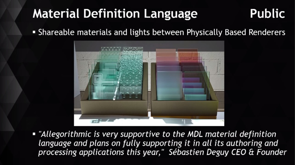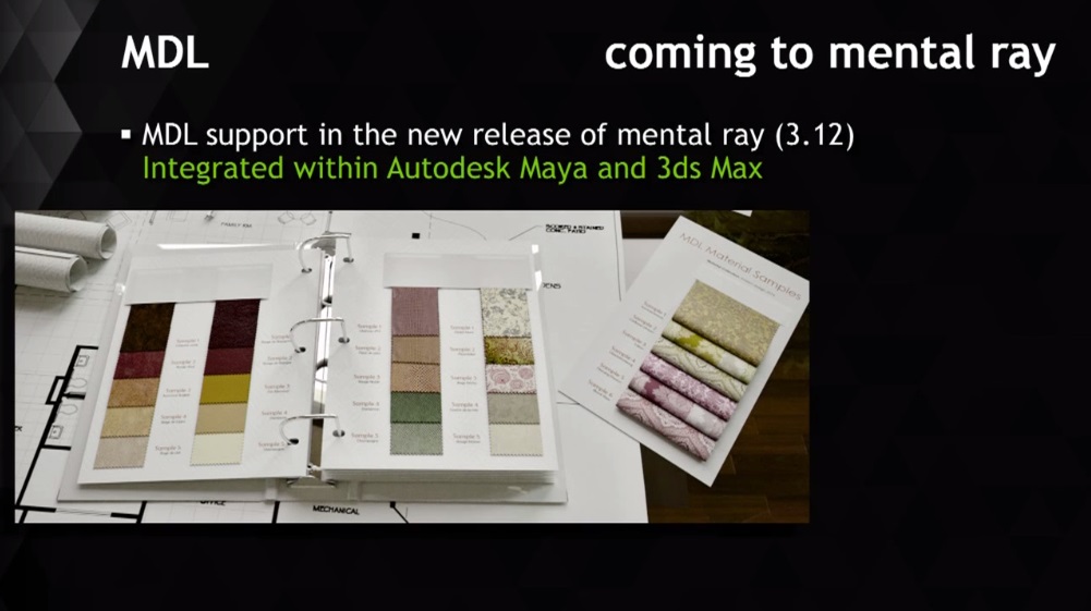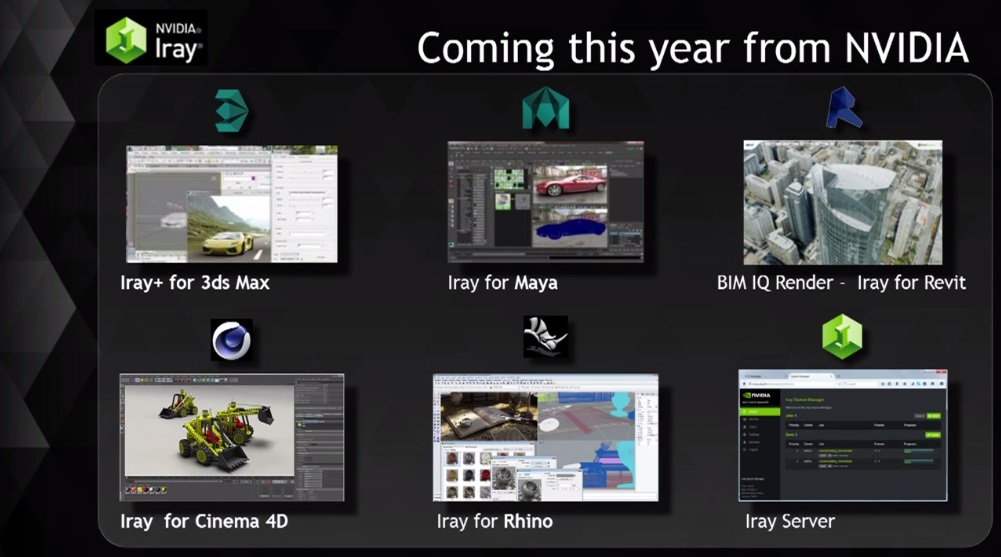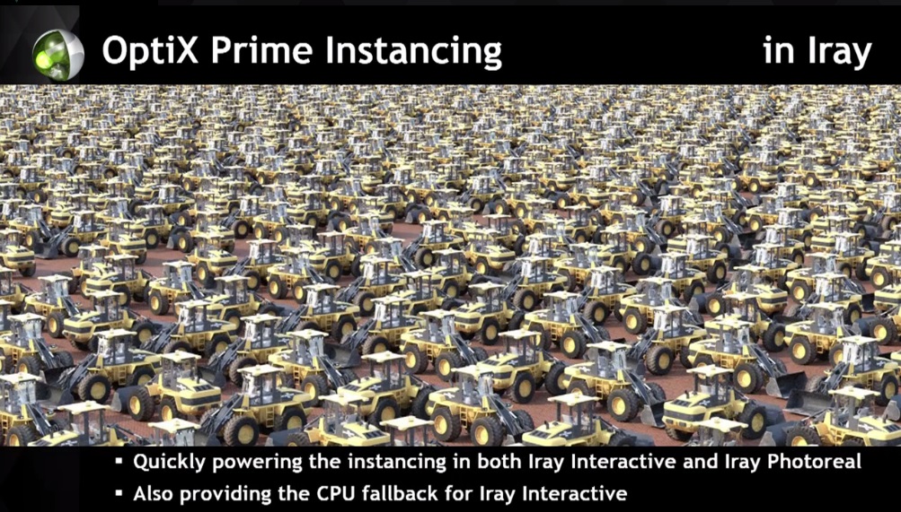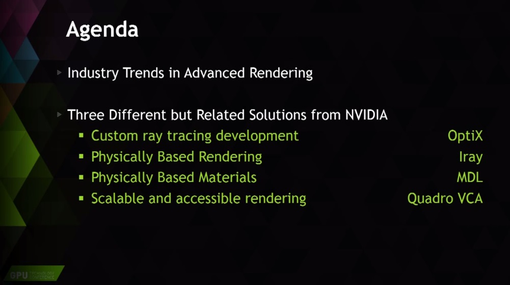 Nvidia為了自家的GPU,配合VCA的硬體,建立了OptiX的Raytracing的framework,這次的GTC也是大量發表OptiX的應用,Iray也就是Nvidia在GPU上的Physically Based Rendering方面應用的主軸,配合新的Physically Based Material 的描述語言MDL,整合在Iray Photoreal與Interactive的模式下。