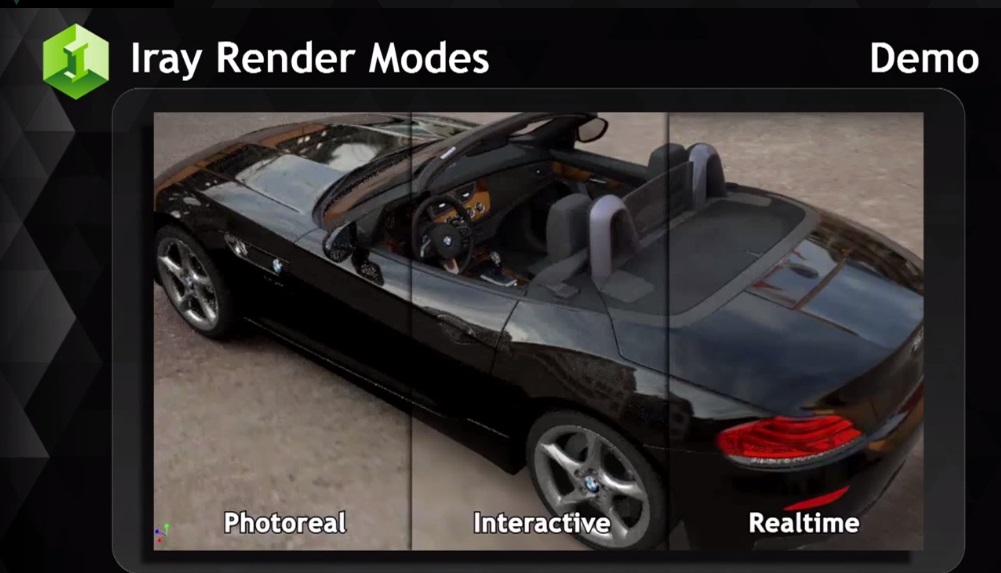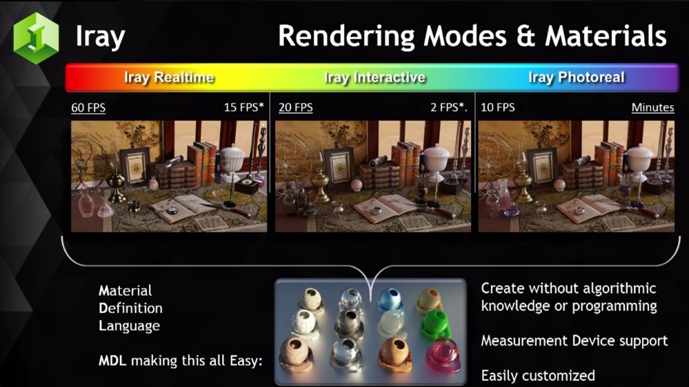 在Iray裡,Render模式可以是Photoreal, Interactive, Realtime,這些模式可以依照品質需求作切換,互相Blending,最重要的部分莫過於MDL(Material Definition Language)的整合,可以利用一種材質描述語言應用在這三種模式裡,之後在Mentalray 3.12後也支援MDL。