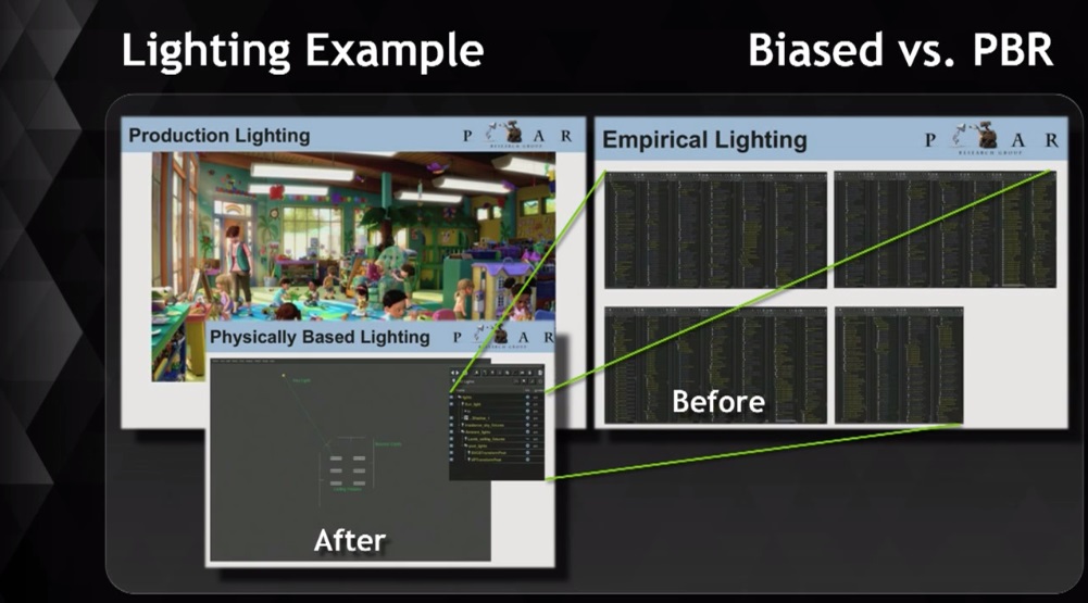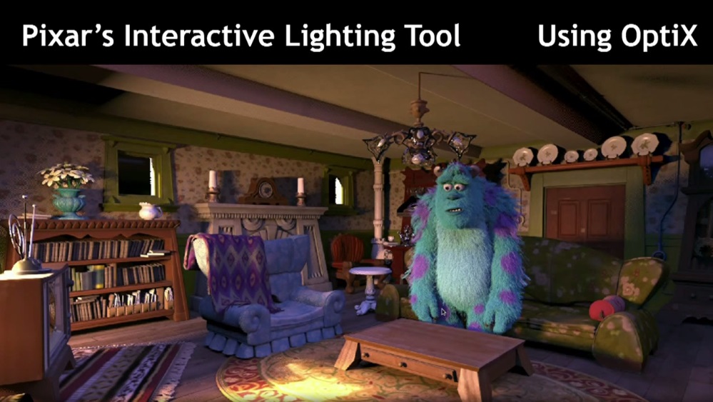 OptiX的應用也在Pixar的Realtime Lighting系統中,透過Physically Based的GPU GI,有效的將原本巨量的燈光資料減少。