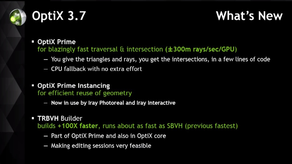新的OptiX 3.7,有快速的用簡單的程式碼做三角形與ray的遍歷與相交測試,也增加了instance的功能,可以節省幾何元件在記憶體的資料量,提升重複的使用率。還有比之前SBVH快100倍的TRBVH Builder,為的是可以快速建立Raytracing需要的BVH資料,新的3.8版本還有提供Progressive API。