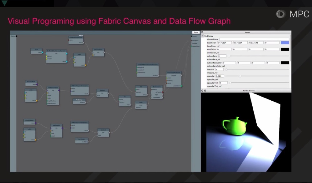 MPC也使用了新的Visual Programming “Canvas”界面來打造OptiX的Realtime Shading Pipeline,在OptiX裡實做了CUDA版本的Disney的Physically Based Shader。