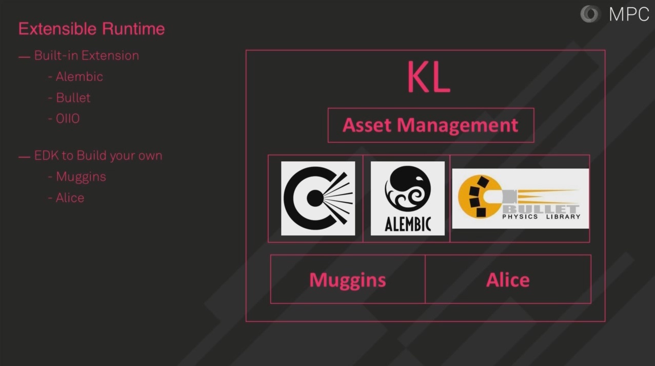 Dekko使用Fabric Engine當作場景管理(Scene Assembly)的核心,透過Fabric Enging的KL語言對幾何元件的Extension API來讀取場景與幾何資訊,建立出Asset管理的系統,包含整合Alice(MPC Crowd System)與Muggins(MPC內部的inhouse工具開發庫)。