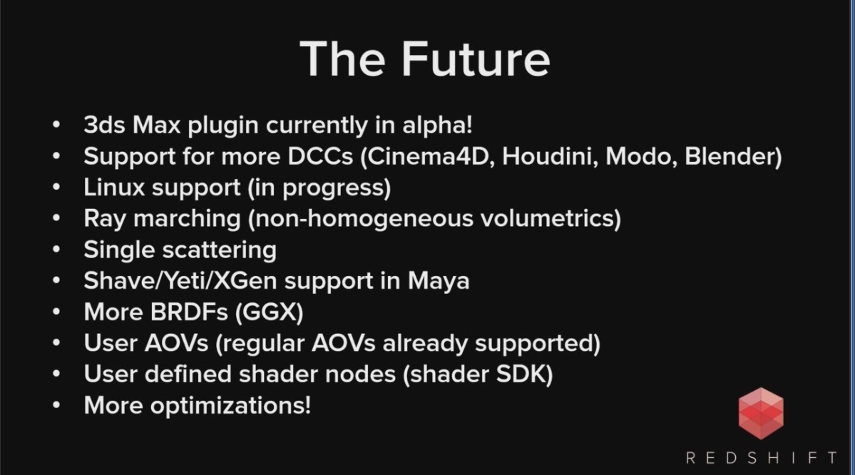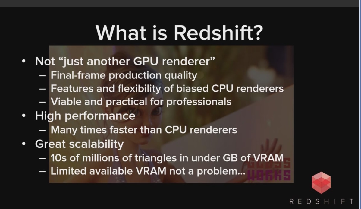 在一片GPU-based Renderer推出時,大家為了raytracing的效率,紛紛使用Unbiased path tracing的方法來當作GPU Renderer RayTracing的方法,但是Redshift所製作的GPU Renderer反之使用biased的GI Render方法,類似於Mentalray或VRay的架構使用來達到控制Noise的方式,提高Render品質。遇到的問題也是在Geometry與Texture的,透過自行開發的Texture Cache讓GPU可以有效存取Texture的資料,唯一的瓶頸也就是GPU的記憶體,但是Redshift的使用自家的Caching System來交還out-core的幾何與貼圖資料,突破了這個限制,並支援UDIM與UVTILE的貼圖格式,Shading與Material的支援多達200個Node,可以建立更多的組合與可能性。
