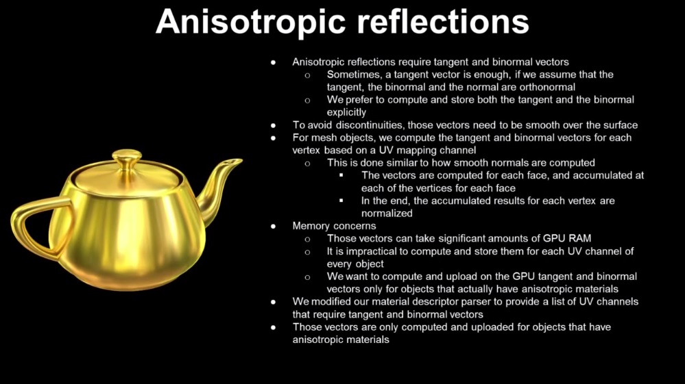 在GPU上使用Anisotropic的Shader的時候,需要從幾何元件的UV Channel取得tangent vector與binormal vector,大量的幾何元件在GPU中包含這些資訊需要大量的GPU記憶體,也特別將有Anisotropic的Shader才會將這些資訊上傳到GPU處理,減少記憶體的使用。