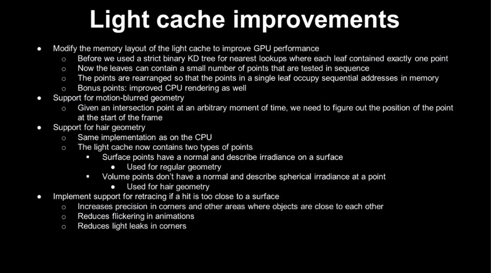 Light Cache的改進包含支援在GPU記憶體的Layout方式來提升效率,為了支援Hair,也新增了一種Volume Point的類型,來紀錄該點spherical irradiance的資訊,用於Hair Shading。