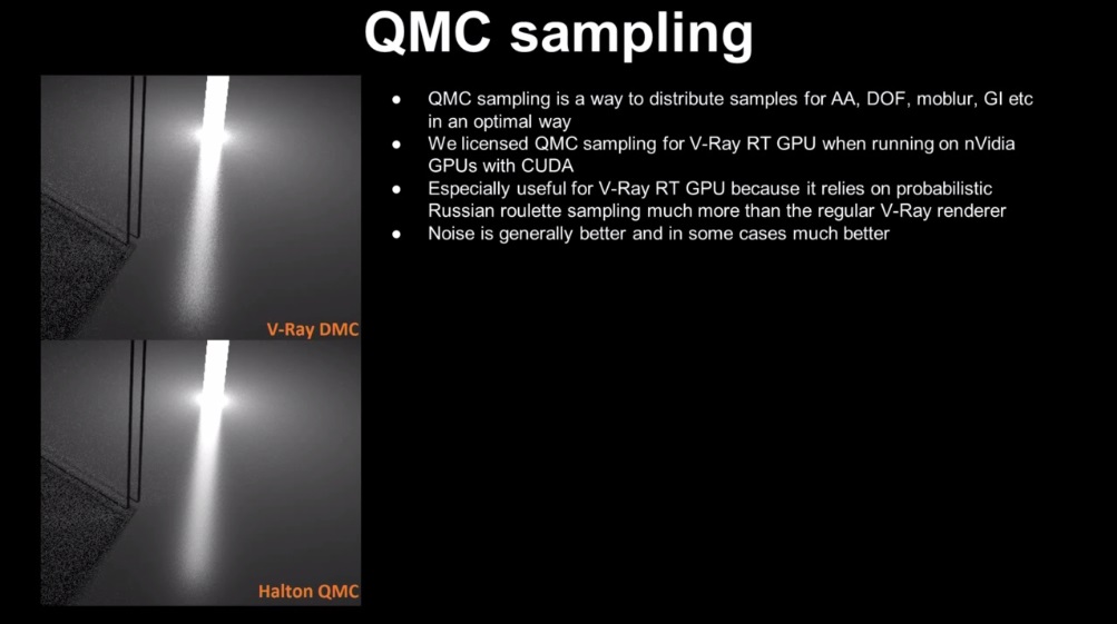 V-Ray這次發表的部分包含了許多在GPU上的功能上與核心的改進,像是GPU運算時需要的特殊Buffer(像是Ramp,特殊Shading需要的Lookup Table等),Texture Paging,改進的GPU的Code Debuging,取得在GPU上使用QMC Sampling的授權得到更好的品質,而且使用統一的原始碼編譯到不同的運算裝置等等。