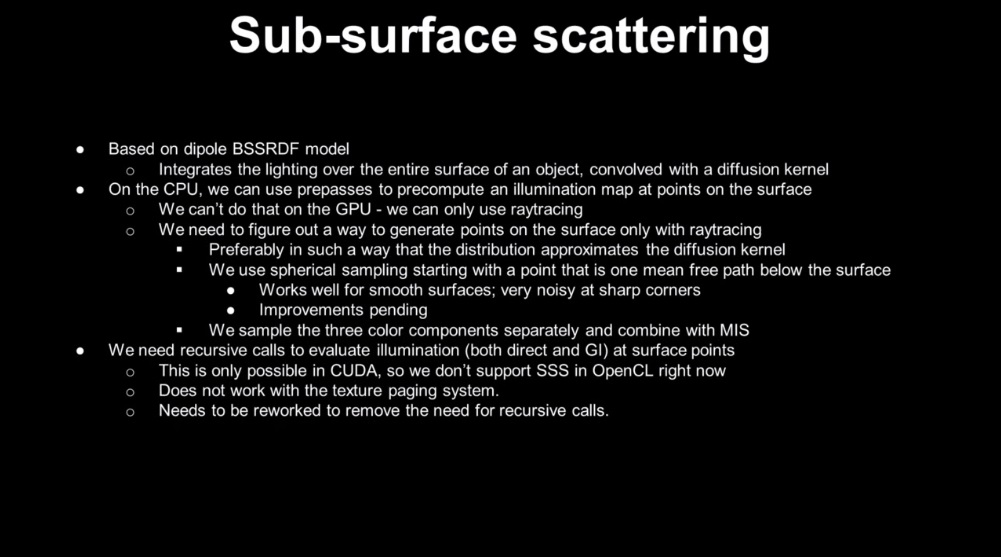 在SSS的部分,因為在CPU可以使用illumination Map的Pre Pass來達到SSS的效果,但是在GPU上只能使用Raytracing,因為需要針對Surface Point做illumination的recursive call(遞迴),所以只能在CUDA的裝置上跑,不支援OpenCL,同時也不支援Texture Pagine。