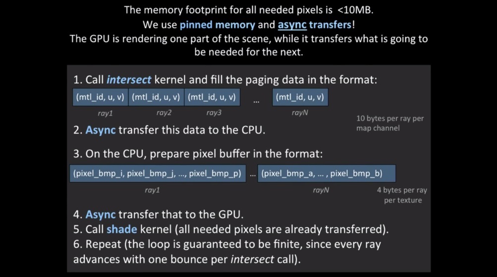 在Texture Paging System方面,基本上是先從GPU做了許多intersect之後,將需要取得材質ID與UV結果傳給CPU,CPU把需要的貼圖Pixel資訊全部讀完後傳回GPU做Shading,這些動作需要小於10MB的額外記憶體來維護。