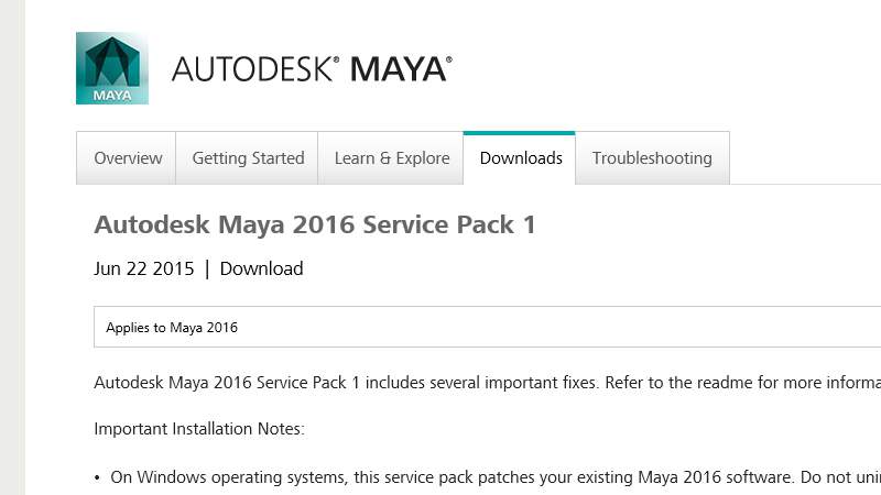 下載位置 Autodesk官方網站 Maya 2016 Service Pack 1 Release Note