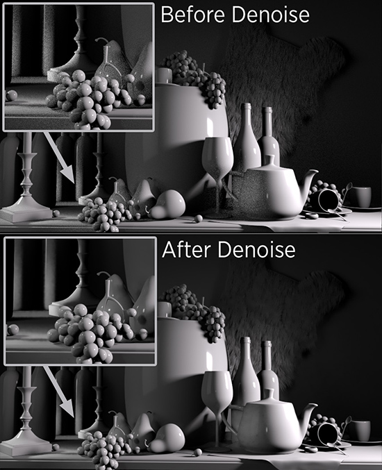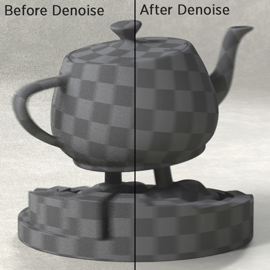 在Raytracing的流程中,ray sample數量一直決定影像品質的重要因素,不管現在任何renderer,都脫離不了這個原則,所以有各式各樣的Sampling的方法出來,包含Importance sampling(IS),Multiple Importance Sampling(MIS),讓sample數量不會增加但是可以有效的分佈在重點,但是在sample不足的部分,就會有noise產生。noise要被消除,有兩種方式,一種是用大量的運算量去解,也就是倍增ray sample的數量,運算時間會隨著Sample數量而增加。另一種則是使用影像處理的方法,使用Denoise的filter做Post Process,這時候可以在noise數量有限的狀況下做快速有效的消除,消除的效率與效果也跟所使用的演算法有所差異。
