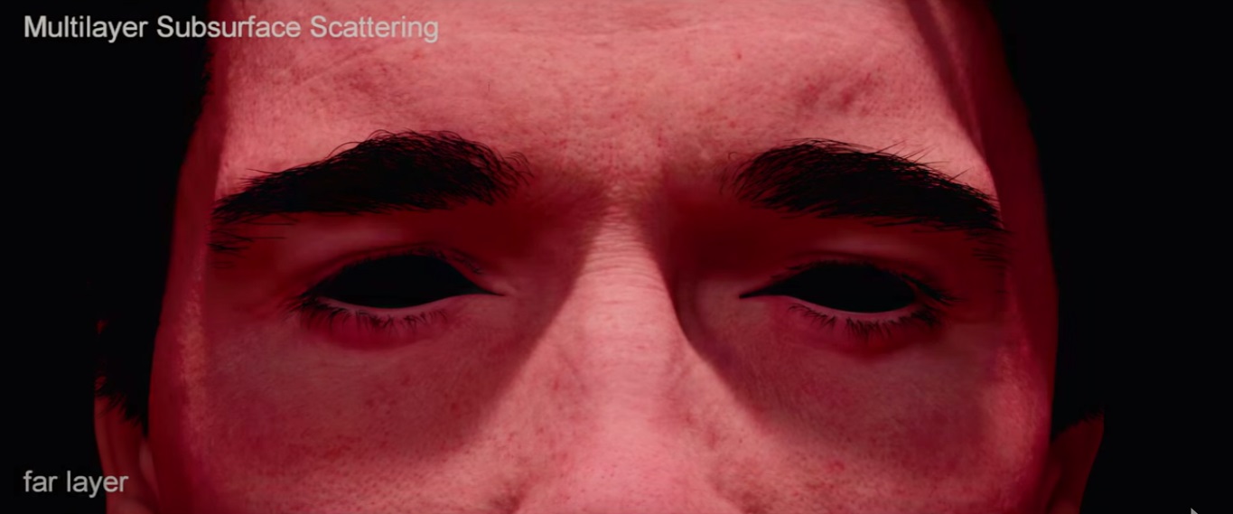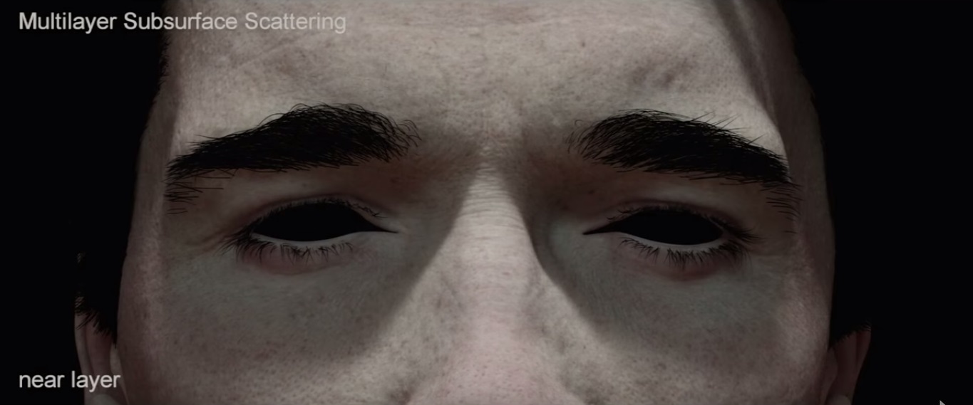 在皮膚的模擬部分,著色的部分使用了RenderMan的基於RIS的multi-layering開發的Skin Shader,使用微距攝影拍攝一些皮膚的數據,試著抽取出每個區域皮膚的細節作為Shader的base layer,還加入了血流模型(blood flow model)。眼球的部分也是解剖學正確的,包含角膜,虹膜,還有眼瞼層的連接方式,眼睛的Shading包含折射(Refractive)與散焦(Caustic)效果,但是並非完全使用Raytracing,使用預先計算物理正確的入射光線焦散,達到可以讓藝術家調整的空間。數位版本的Arnold有13個不同頭髮的系統。使用MPC的Hair Grooming系統Furtility來製作,並使用RIS做Raytracing達到更正確的Shading結果。