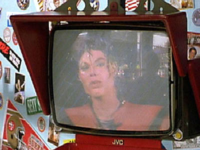 marty回到未來世界後,到了80’s Cafe中,裡面有著當時類似3D的雷根與伊朗強人何梅尼還有麥可傑克森,模仿知名的英國電視中世界上第一個虛擬角色,雙面麥斯(Maxx Headroom)風格的電視頭像,很妙的是,麥斯其實是偽3D,很多人在當時可能都不知道,這個虛擬角色其實是真人扮演的,同樣的,80’s cafe裡的video服務生也是由真人扮演。