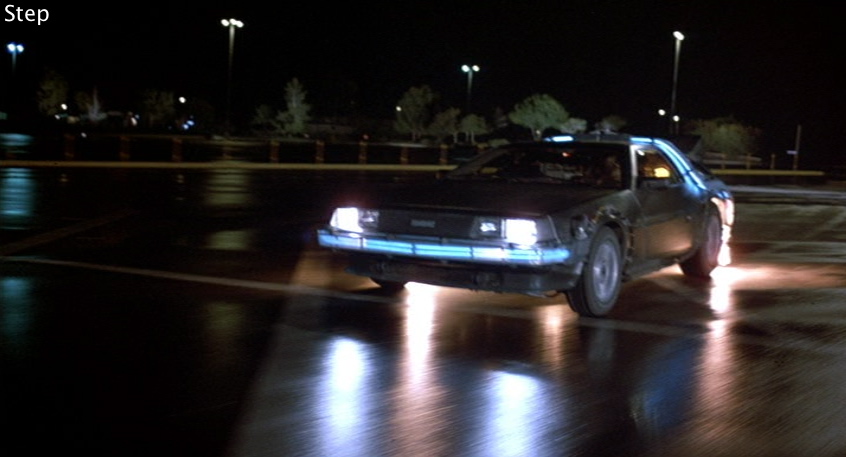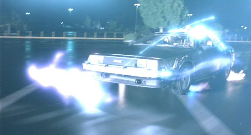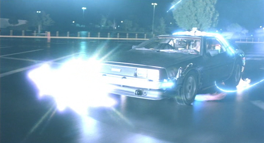 這是回到未來的Delorean時光車的在時速88 mile時會在車身外面產生光流的經典效果,這個效果在當時1985,基本上製作的方式跟Starwar的光劍(Light Saber)相同,主要的火焰與火花是在片場中拍攝,其中的拖曳光班(Comet Effect)、閃光(Glow),是找動畫師在白紙上使用噴槍噴上黑色顏料,一格一格地畫出連續的影像,使用動畫攝影機專用使用的攝影機frame by frame錄製拍攝到影像中,提供給影片光學的人員,在使用負片曝光當遮罩,再把原始的拍攝背景(background plate),做二次曝光,形成了光班流動的效果。