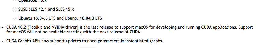 根據 CUDA Toolkit 的 Release notes,本週的10.2更新將是“最後一個支持macOS開發和運行CUDA應用程序的軟件”