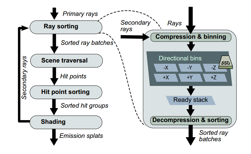 在上面的概述,該過程開始於從camera發射出的primary rays,Hyperion執行ray的排序,並以展開的角度將ray以方向來群組成一個大量,排序過固定大小的ray的批次(batches),通常每個批次約30到60M條ray,根據ESR2013的論文,系統會串流(stream)不活躍的ray批次到local的固態硬碟(SSD)裡,直到系統準備好進行排序與trace下一個批次。