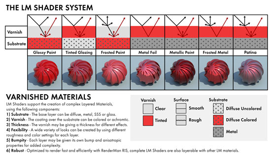 使用Layered Material System(LM),幾乎可以使用高度逼真的物理模型,產生任何類型的表面,該Shader系統的核心是基礎材質(diffuse, glass, subsurface等等),在上面的層是類似漆(varnish)或透明塗層(clear coat),這些完整的材質,可以分層的來建立複雜的表現。